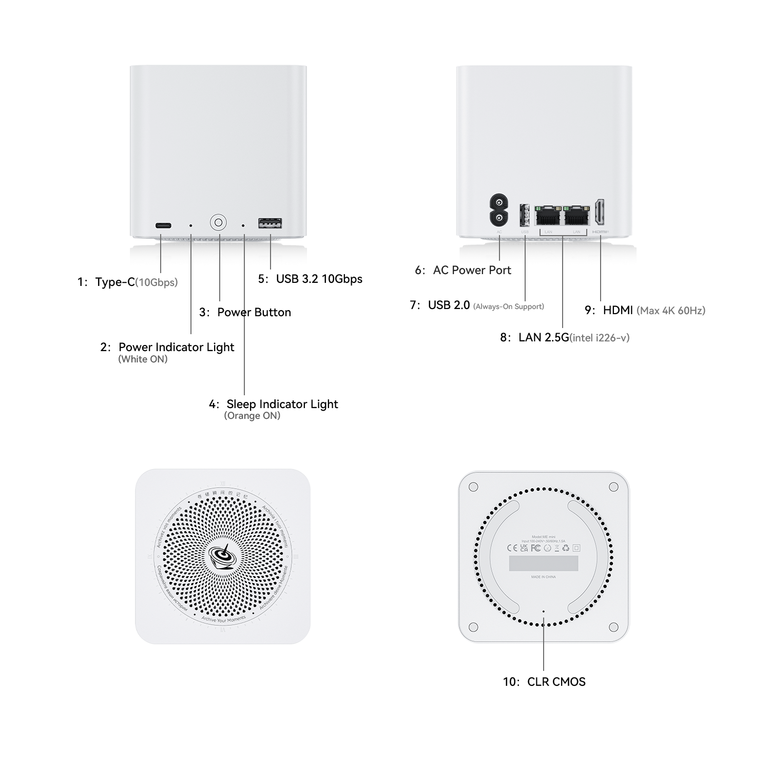 Intel® N95/N150| 6*SSD Max. 24 TB | Lärmfreies Erlebnis | Vertikales Luftstrom-Kühldesign | 16 GB LPDDR5 | Integriertes Netzteil | 64 GB EMMC | Zwei 2,5-Gbit/s-Hochgeschwindigkeits-Ethernet-Ports | 3 stilvolle Farben verfügbar | Kompaktes Design