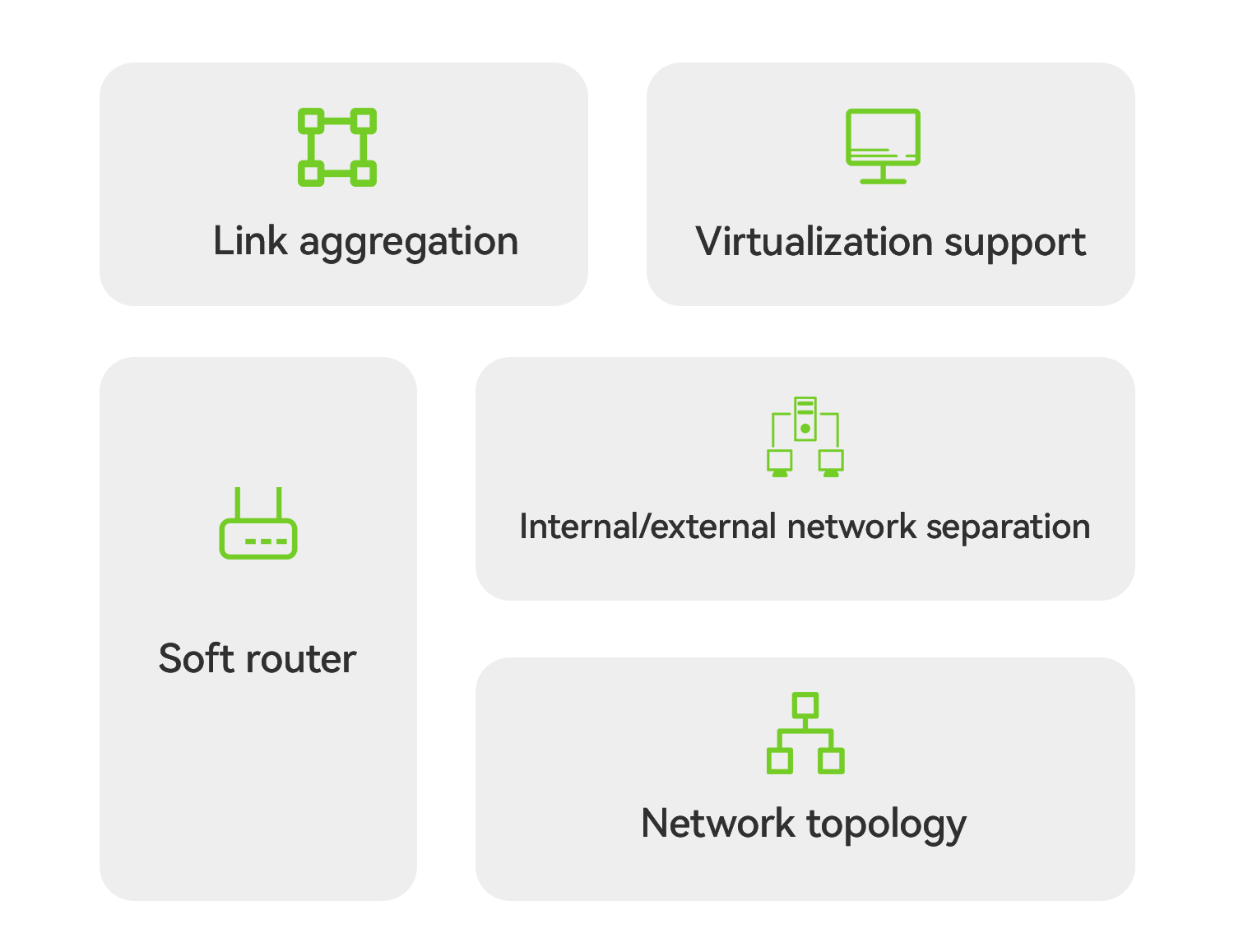 Admite múltiples modos de red, como agregación de enlaces, virtualización y enrutamiento de software, y es adecuado para escenarios domésticos, de oficina y de servidores livianos, combinando la solución de red óptima según sea necesario.
