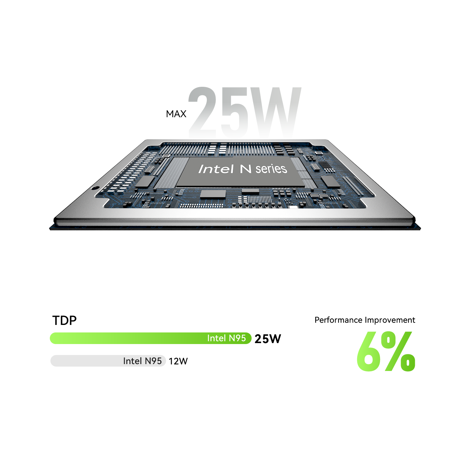 Equipado con un procesador Intel N95/N150 de cuatro núcleos, con una frecuencia turbo máxima de 3,4/3,6 GHz y una mejora de rendimiento del 6% respecto a la versión de 12 W con TDP completo de 25 W. Admite múltiples formatos de códec como AVC, MPEG2, MJPEG, HEVC y VP9, adaptándose a diversas necesidades de procesamiento de audio y video.