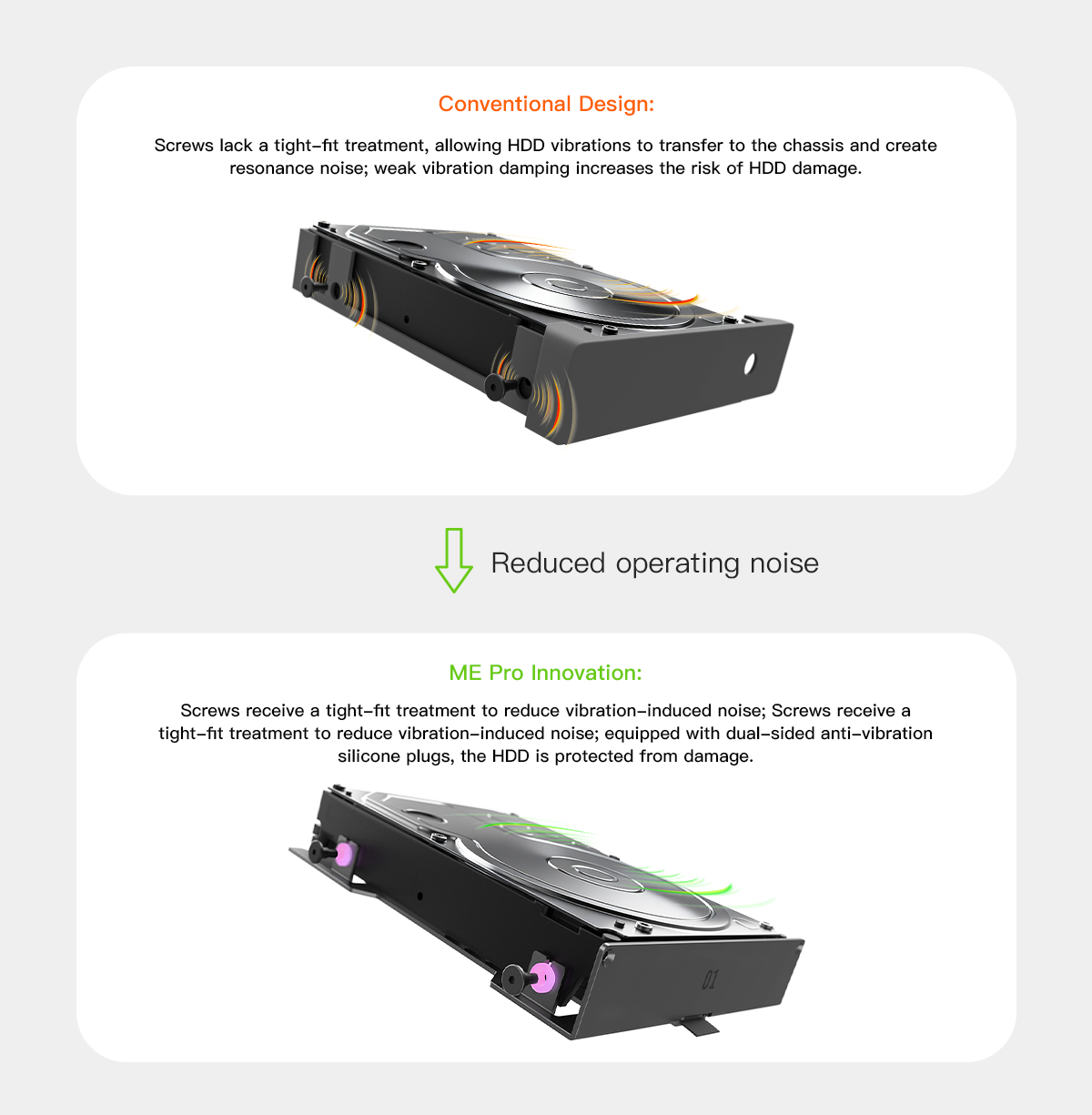 Los diseños convencionales, debido a la falta de ajuste de los tornillos, son propensos a provocar que la vibración del disco duro resuene y dañe el disco duro; ME Pro mejora de manera innovadora el proceso de apriete de tornillos y agrega tapones de silicona antivibración de doble cara, brindando protección dual para reducción de ruido y protección de la unidad.