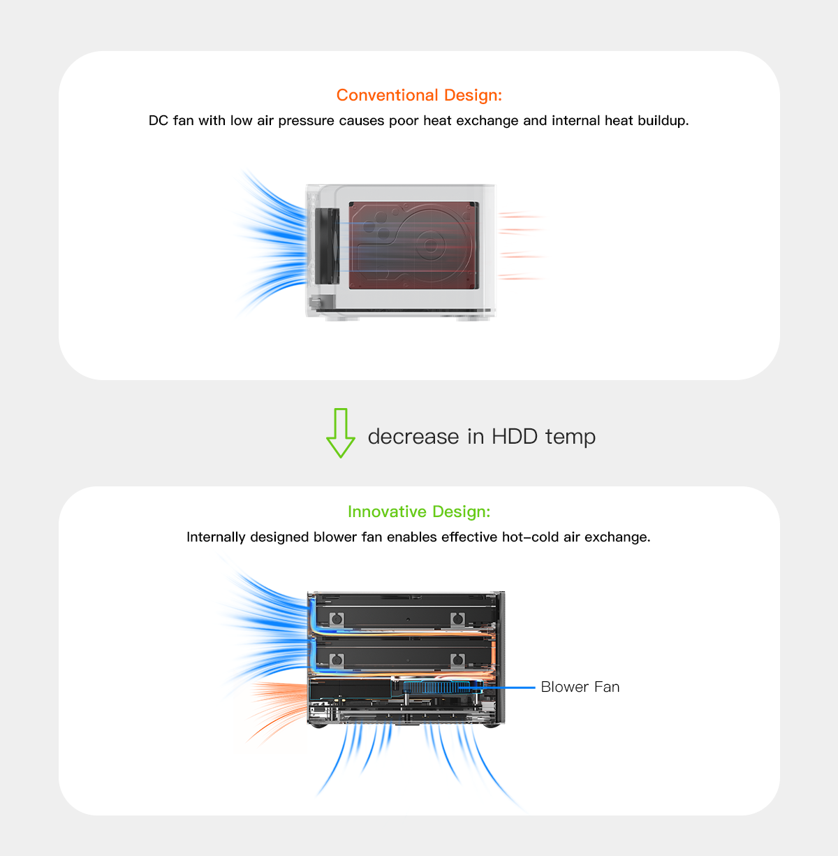 Si bien los diseños convencionales carecen de componentes de conducción térmica dedicados y, por lo tanto, no pueden ofrecer el trío completo de funciones críticas de procesamiento de calor (conducción, distribución y disipación de calor), la innovadora integración de almohadillas térmicas y soportes de aluminio del ME Pro permite un sistema completo de gestión térmica de tres etapas que reduce la temperatura y extiende la vida útil del disco duro.